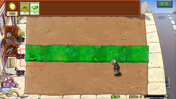 4、叠种豌豆根,先在场上种下三次叠加的豌豆根,可同时攻击三条路线,但每次叠种会额外消耗25点阳光。