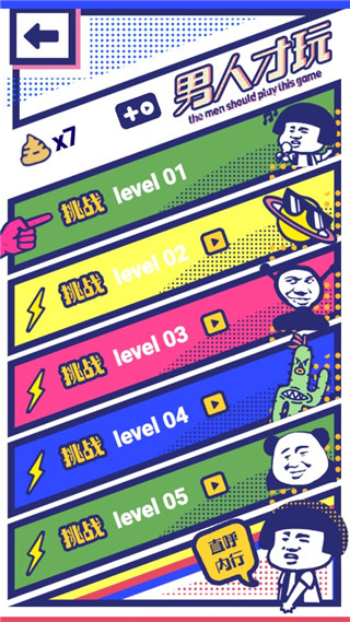 男人才玩游戏是以搞笑为核心打造的全新手游,游戏结合了多种热门元素,为玩家带来了不一样的闯关体验,在这个游戏里玩家将扮演闯关达人,根据关卡的要求进行闯关,每个关卡的难度和玩法都不同,氛围轻松治愈,操作简单易上手,可玩性极高,超多搞笑的剧情和爆笑画面等待玩家去体验,并且还有很多彩蛋等玩家发现,感兴趣的玩家可以下载试一试。