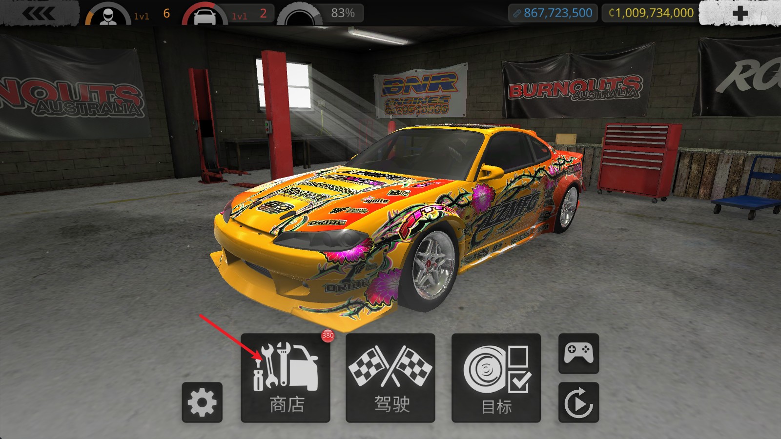 1、在主界面点击“商店”,即可进入你的专属车库,开始改装之旅。