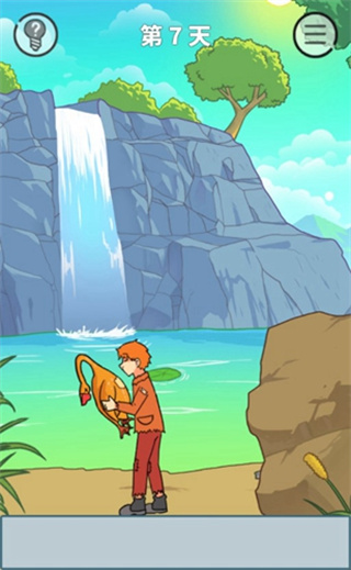 这一关,需要巧妙利用鱼骨,手持鱼骨,当河里那条大鱼游过来的瞬间,把鱼骨扔进水里,就能把大鱼砸晕。然后直接捞起来,就能吃掉它,顺利过关。
