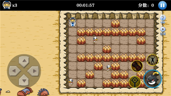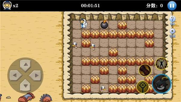 2、游戏界面左侧是控制角色移动的虚拟摇杆,右侧则是用来放置炸弹的按钮;