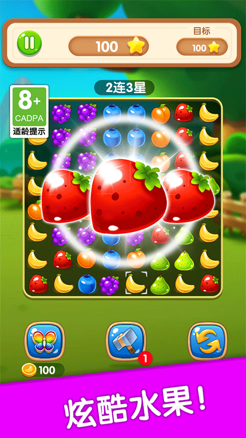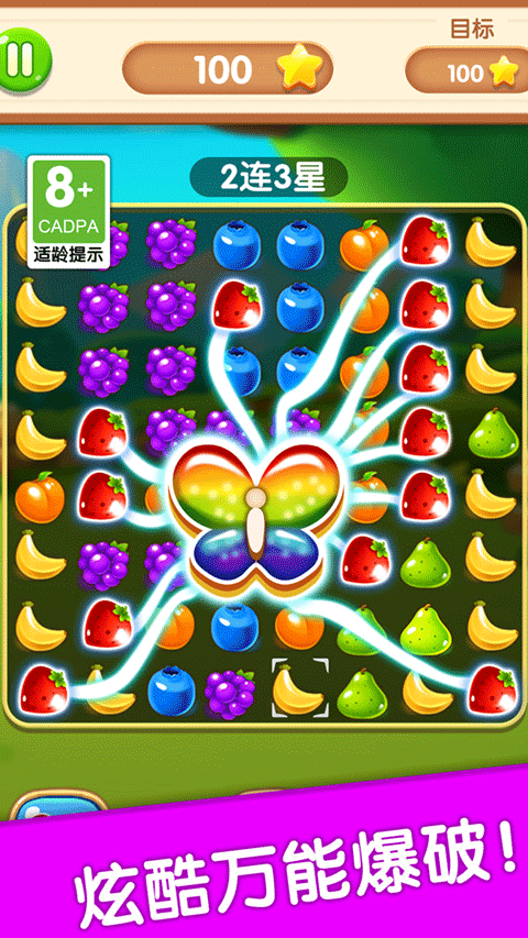大量的关卡和各种类型的水果,给你带来有趣的三消体验和无穷无尽的乐趣三消过程,各种游戏模式可以很容易地选择,玩家需要挑战自己的极限,不断消灭,实现清屏,清除的水果越多,你的分数就越高。惊险的淘汰过程和完美的特效会让你兴奋不已,欢快的三消音效开启了一场超级好玩的三消休闲游戏,让你无比开心,满心欢喜。