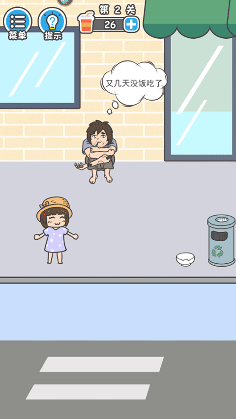最开始,你可以捡起路边的碗,按住并将碗拖到乞丐身上,路人看到后会施舍你一些钱,这样你就能成功通关。