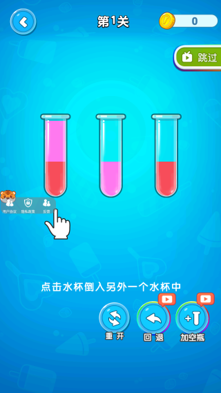 1、点击倒水大师“开始游戏”按钮,从最基础的第一关开始挑战,随着关卡推进,难度会逐渐增加。