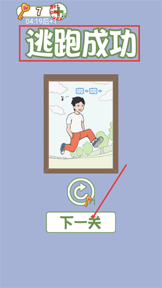 4、通关与继续挑战,当完成【逃跑成功】的目标后,点击【下一关】按钮,消耗相应数量的钥匙即可进入下一轮关卡,继续你的挑战之旅。