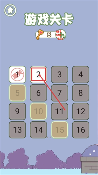 1、选择关卡,在关卡地图上点击你想挑战的关卡,例如【2】号关卡,消耗一把钥匙即可进入游戏开始挑战。
