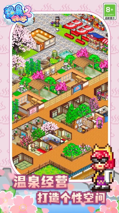 一款以温泉为主题的模拟经营游戏,由知名游戏公司卡罗伊游戏公司开发,延续了卡罗伊游戏公司一贯的经典视觉风格,游戏采用卡通像素风格制作,包含多种游戏场景、多样化的游戏内容以及逼真的角色设计,让人感觉仿佛置身于一个真实的城镇世界之中。