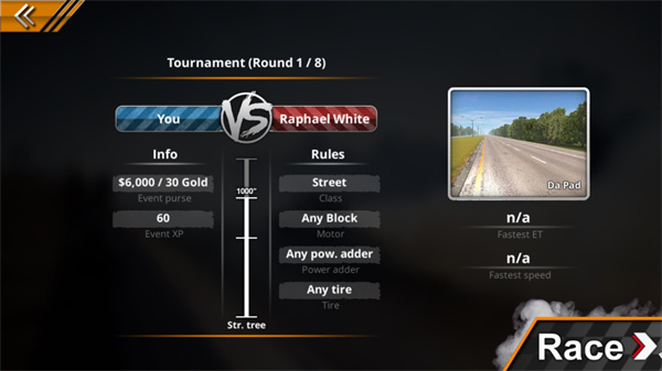 5、进入街道后,需要选择具体地图进行挑战,选择完成后,点击“Race”按钮开始比赛。