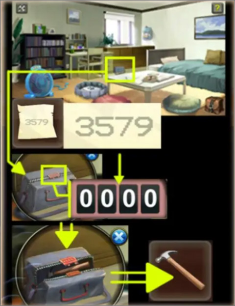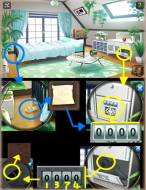 1、点击主场景左侧床底的纸条获取线索,再点击右侧柜子,输入密码 0011 打开柜子,取出黑色筒,输入密码 13741 打开后获得钓鱼竿;