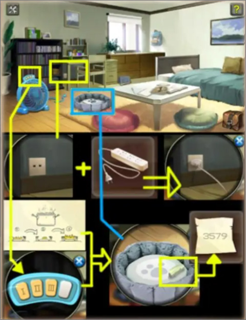 2、点击电风扇上方,按照纸条提示依次点击 2、1、3 档,纸条会被吹到狗窝,再次点击狗窝获取纸条内容;