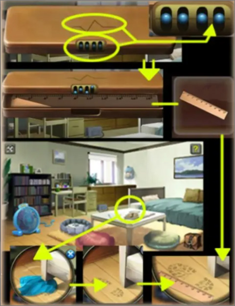 5、根据文具盒图案提示,输入密码获得直尺;点击床右侧布,使用直尺测量脚印;