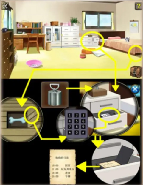 5、使用砝码替换小骨头,第二层抽屉打开,输入密码 5481 获得 “狗狗日常表”(推测狗丢失时间);