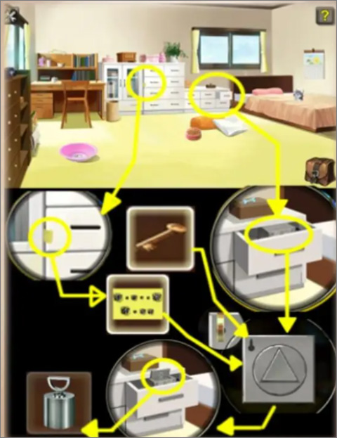 4、点击中间抽屉的黄色纸条,观察字的大小;再用钥匙打开抽屉,依照纸条提示点击图案锁的各个形状,获得砝码;