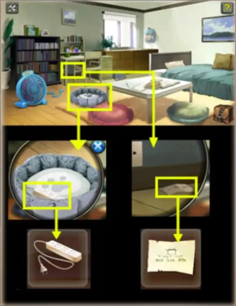 1、点击狗窝获得插线板,点击书柜右侧桌子下方获取纸条;