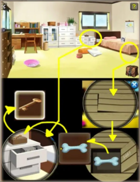 3、点击靠床地板,打开获得小骨头,观察掀开地板的数字;点击床左侧抽屉,用骨头替换上方钥匙;