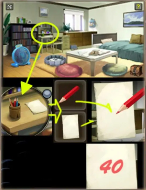 6、点击书桌右侧桌子,获得笔和纸,用笔写下鞋码 40(41 为错误)。