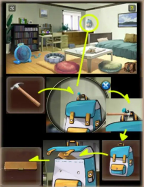 4、点击书包,用锤子去除书上的钉子,打开书包获得文具盒;
