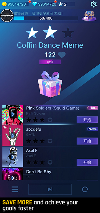 2、选择你喜欢的音乐曲目,每首曲目的节奏和难度各不相同,适合不同水平的玩家。