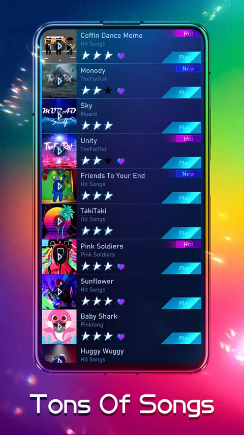 连续点击瓷砖以跟上音乐的节奏,确保不遗漏任何瓷砖,以便成功通过关卡,精美的动态游戏风格和有趣的游戏玩法使其更加有趣和刺激,各种游戏模式也很不错,有众多有趣的游戏模式和有趣的玩法元素,使其更加吸引人和令人兴奋,可以自由选择不同难度级别的各种游戏,并享受玩游戏的乐趣,各种各样的歌曲类型,包括多种音乐风格,都将通过网络不断更新,让您每周都能听到新歌。