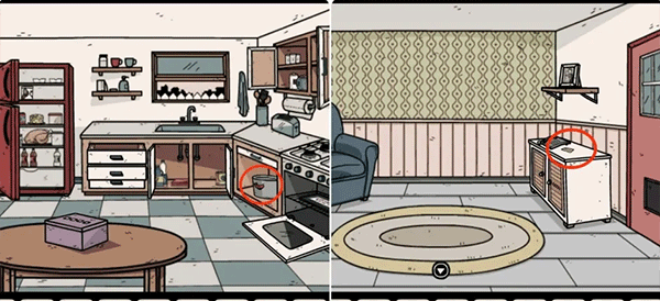8、进入厨房搜刮道具,可以获得烧鸡、火柴和皮皮虾。灶台下方的两个柜子中,可以找到第三只收集要素以及饼干提示(提示包含饼干的图案和顺序)。