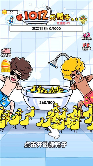 2、游戏开始后,下方会显示金币消耗栏,你可以用金币升级点击能力、雇佣更多人员抓鸭子,或者扩大浴缸容量,让抓鸭效率更高。