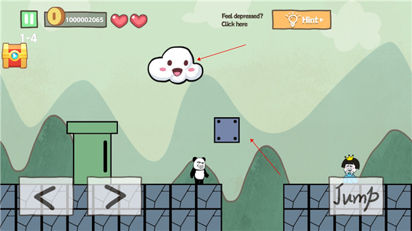 4、这一关不要急着去拿前面的钥匙,先慢慢走,这关和第一关类似,也有隐形方块需要勾引出来,不要从云上跳,因为云也是陷阱,会掉下去。