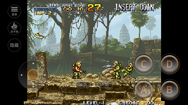 4、合金弹头1金手指玩家通过虚拟操纵杆来控制游戏,可以自由控制角色来接受挑战。