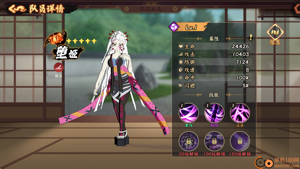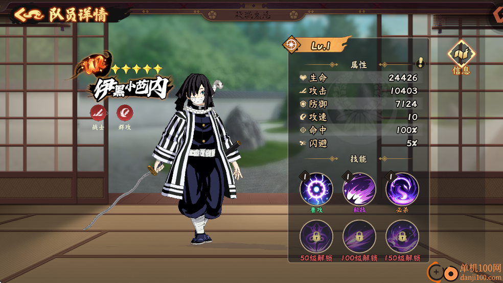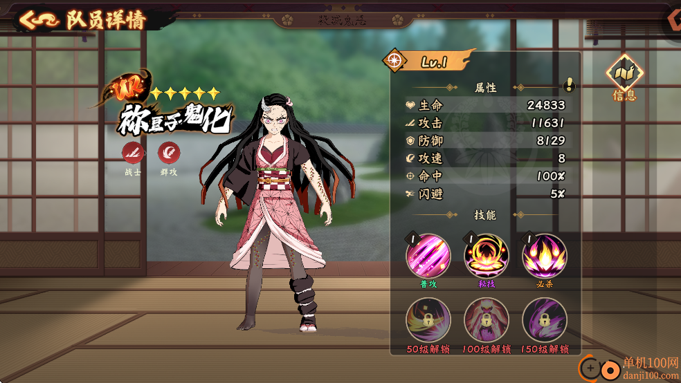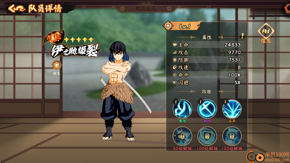 必杀技:【血鬼术 八重带斩】对前方大范围敌人造成攻击力300%的伤害,击飞命中的敌人,并且必定给予目标1层[流血]状态,使其在持续时间内承受额外伤害。