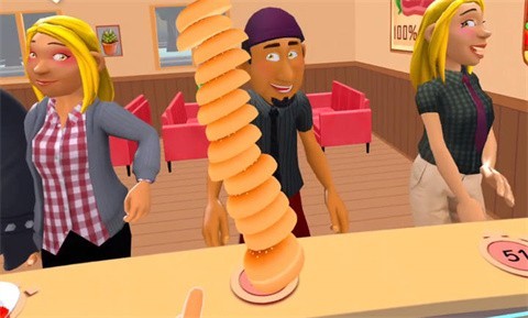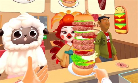 使用工具进行撒放和组合,准备相应的菜肴,菜肴准备完成后,将其呈递给诸如穿着角色服装的顾客或对汉堡有高需求的顾客,检查订单要求,确认配送无误后获取收入,对于诸如多层汉堡之类的特殊订单,适当堆叠诸如面包、肉饼和蔬菜等食材,以确保结构稳定并满足顾客的需求。