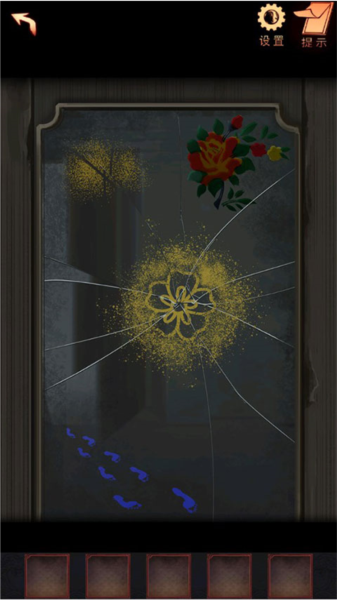 7、点击柜子上的镜子,并使用喷漆罐,你将得到新的线索:黄色的花瓣与蓝色的脚印。