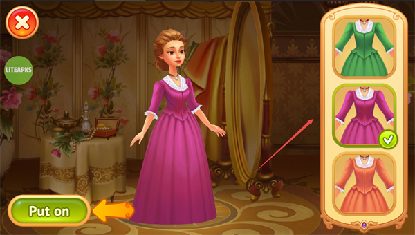 2、你可以挑选各种风格的裙子来为角色打扮,点击“put on”就能穿上进行游戏;