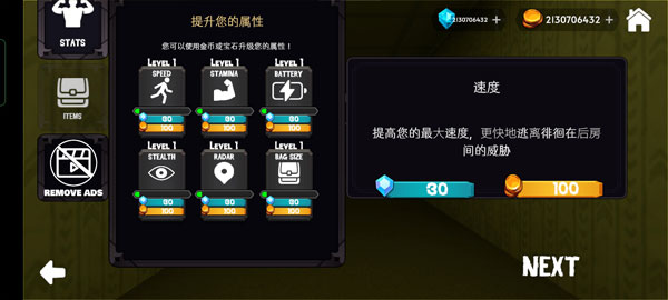 2、你可以使用金币或宝石来升级角色属性,升级完成后点击 下一步 继续。