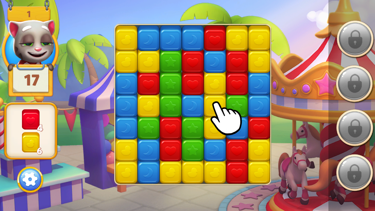 2、汤姆猫消消乐园关卡设计丰富多样,包含收集、清除障碍和限时挑战等任务。