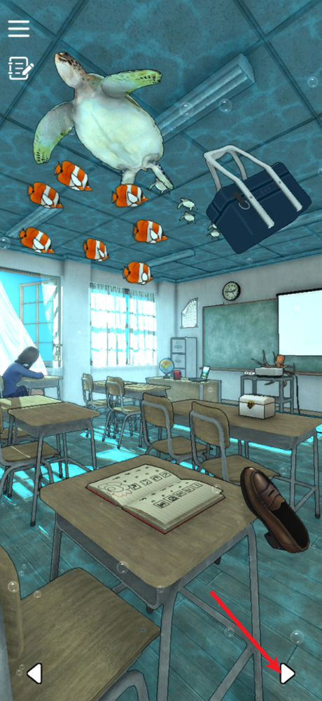 1、进入密室逃脱:青色放课后游戏后,你会来到一个类似海洋馆风格的教室场景,可以点击界面下方的箭头来切换到不同的房间,探索更多区域。