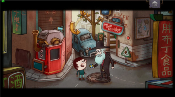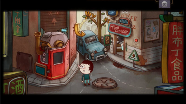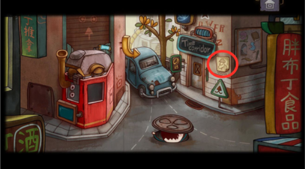 小男孩出来后,点击门口右边的广告牌,掉落后点击红色按钮两次。