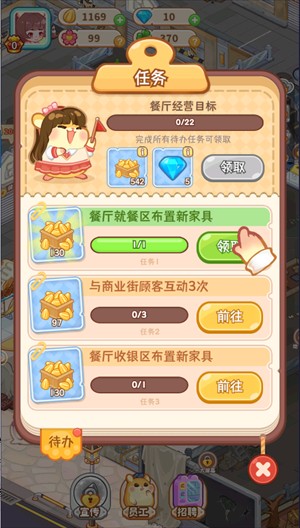 6、玩家还可以培养员工,提高他们的工作效率,使餐厅运营更顺畅。