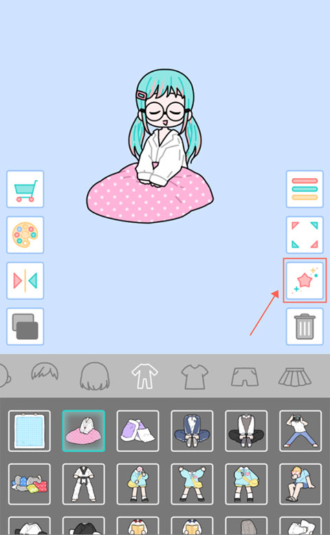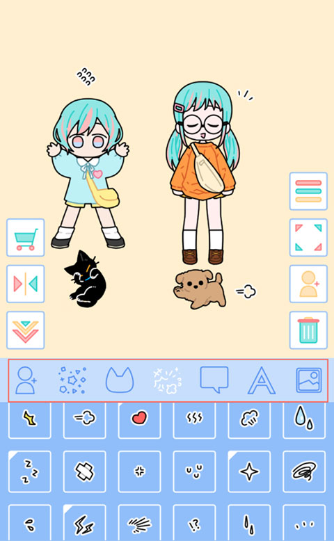 4、进入界面后,先点击下方已经搭配好的女鹅,将她放置到屏幕上,再次点击下方的女孩可以将多个角色添加到屏幕中,长按角色可以自由拖动,向下滑动到垃圾桶按钮即可删除角色,返回主界面时,只需点击右侧的第三个按钮即可。