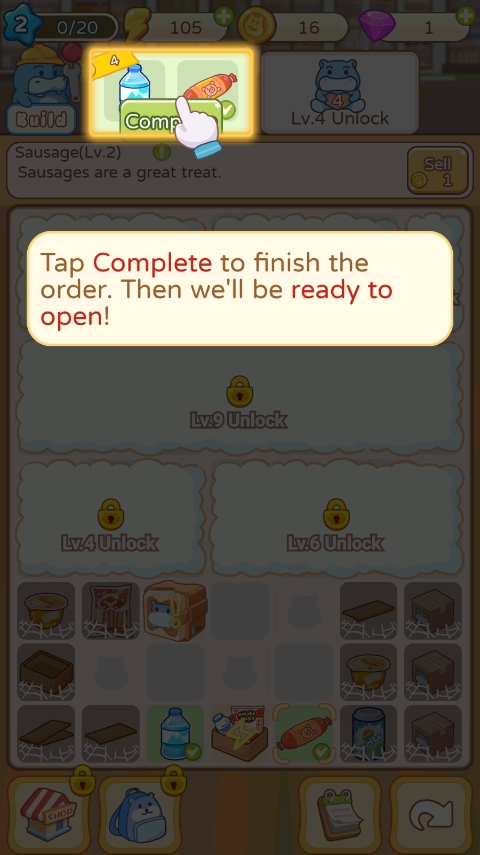 3、将已经合成好的物品,例如矿泉水、香肠等商品,点击进行上货操作,把它们摆放到货架上供顾客购买。