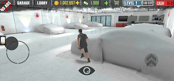 2、完成购买后会进入车库界面,通过滑动左下角的摇杆移动角色,走到任意一辆汽车模型旁边;
