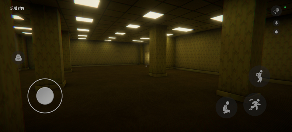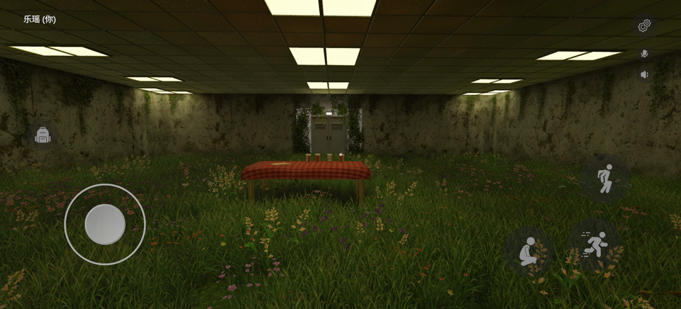 3、游戏使用第一人称视角,左侧的轮盘控制角色移动,右侧则有互动、跳跃、下蹲和奔跑等操作按钮;