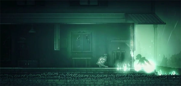 3、流浪者的角度来看。向左走到房前松动的木板处,站在木板上跳几下,打破木板,通过木板下的隧道爬进房子,拿到镰刀。然后他推开门走了出去,把外面的黑怪物摔死了。