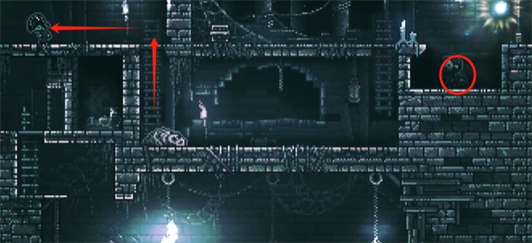 12、爬上枝形吊灯右侧的平台,柱子要断了,将先前推断的支柱推过去修复平台,从平台往左跳去拿钥匙。