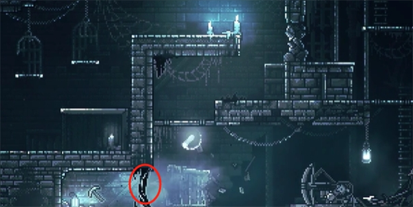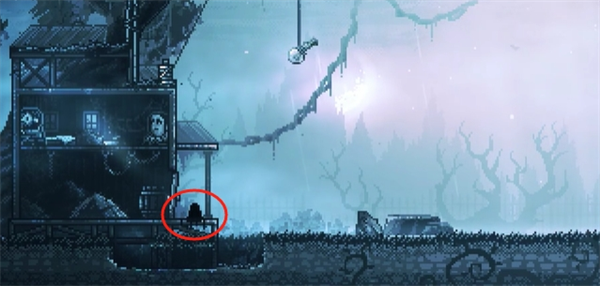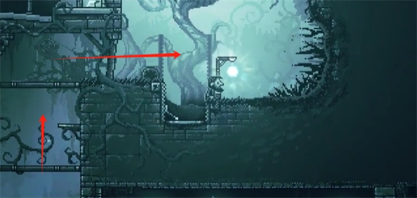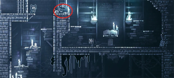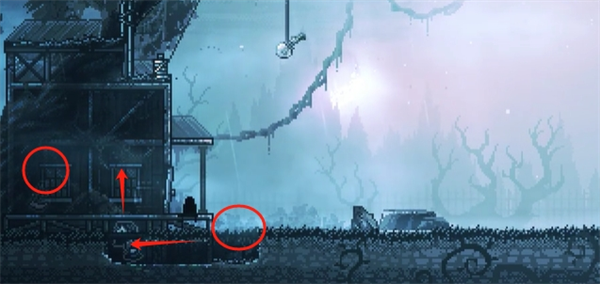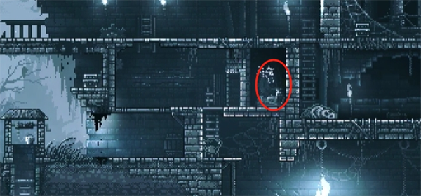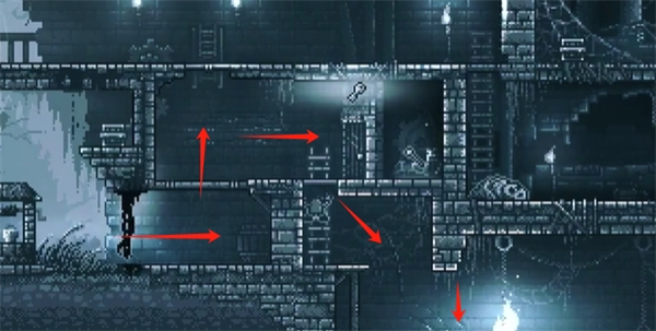 15、在遇到怪物后,快速返回到下图所示的位置,一旦怪物跳过右边,迅速爬上左边的梯子,跑到左边,到达左边尽头后,往上爬,一旦你到达顶楼,向右跑,直到怪物落入荆棘坑。