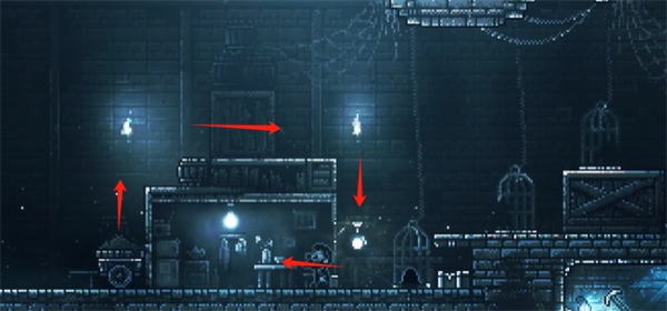 7、流浪者的角度来看。按下黑色怪物左边的按钮,三个铁笼将会升起,爬上铁笼,向右走,然后爬上最右边的梯子。