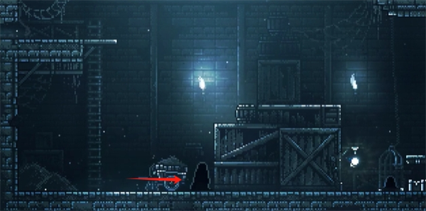 5、将推车推到梯子和黑怪之间,然后爬上梯子,跳上去勾引黑怪,黑色的怪物跳下来后,推了车,把怪物压死了,然后继续向右,进入笼子的左边,那里是黑色的怪物。