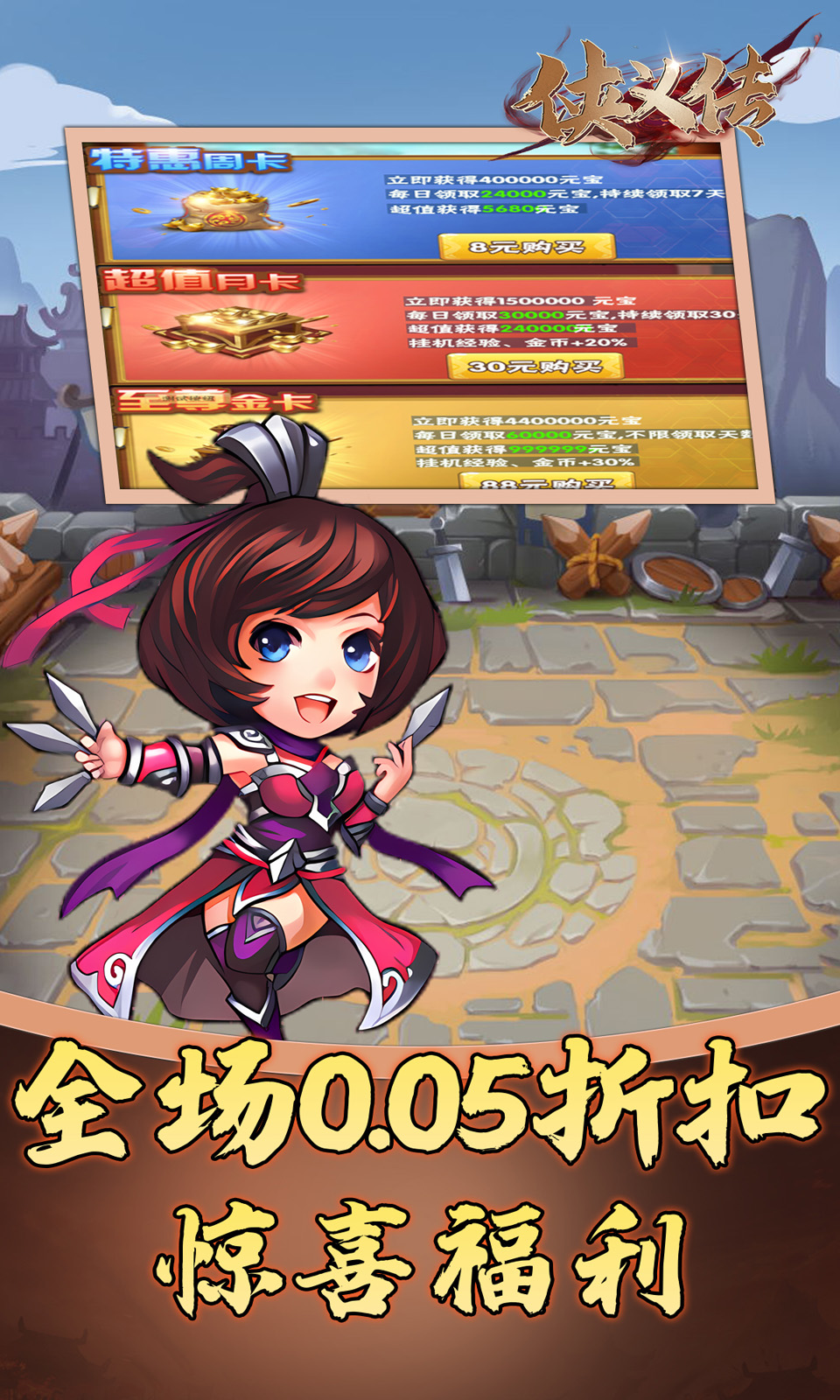 3、侠义传0.05折三国买断版登陆即送橙色武将,专属称号,送VIP16特权。