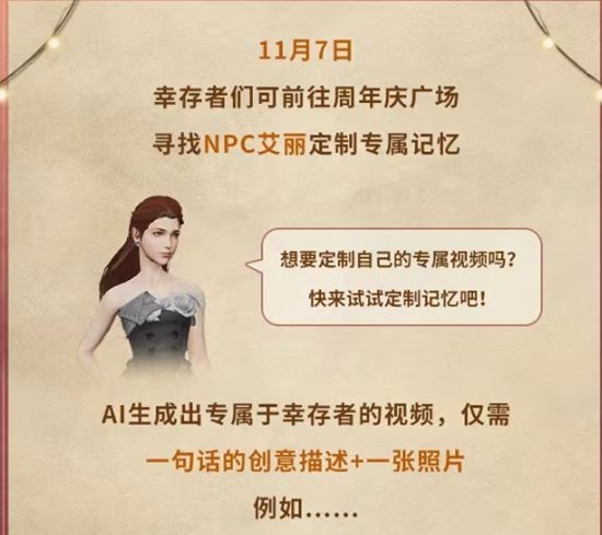 在《明日之后》七周年庆典期间(11月7日),玩家只需提供 一句创意描述和一张照片,AI即可生成一段 专属视频记忆。