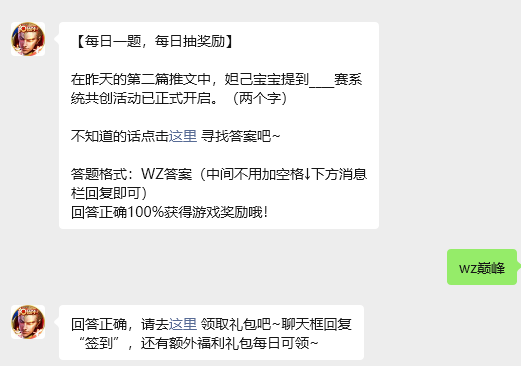 今日问题:在昨天的第二篇推文中,妲己宝宝提到____赛系统共创活动已正式开启。(两个字)