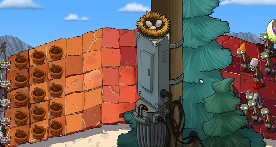 场地为屋顶,左侧三列已配备花盆,可直接种植;若想多种植物,需玩家自行补充花盆。