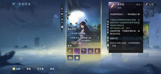 当玩家等级达到25级并完成主线任务“又见青衣人”后,可使用梦华笺接取华章支线任务“一人一世一双人”。